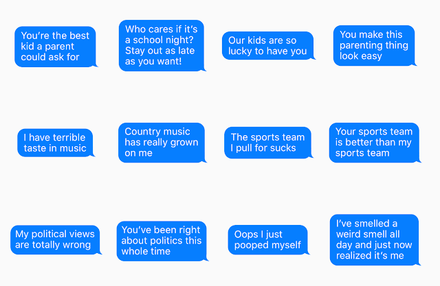 There are a number of fake texts to pick from, ranging from more generic statements, like “you’re so smart,” or “you’re hilarious,” to those that may be more useful in specific discussions, like “you make this parenting thing look easy,” or “the sports team I pull for sucks,” for example.